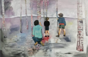 Cecilio apela a belleza de la sencillez y el elogio de la síntesis con cuadros serenos que invitan a la observación tranquila y armoniosa. Alejandro aporta una plástica contundente, enérgica, con muchas capas, construyendo paisajes psicológicos de cromatismo atrevido y palimpsestos geométricos. También impulsivas y espontáneas, pero más orgánicas, son las obras de Mina K, que parecen hundirse en el caos original para emerger con descaro y ofrecernos el pulso humano en su complejidad más certera y honesta. Finalmente, Andrew juega con una figuración engañosa. Poniendo en tela de juicio la propia posibilidad de la representabilidad, relaciona motivos tomados de viejas enciclopedias y, descontextualizándolos, formula mundos inexistentes de modo similar al proceso creador de las inteligencias artificiales.