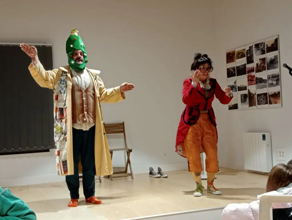 Así lo pudimos disfrutar, en la sede de la AAVV San Joaquín (Campogiro), el pasado día 22 de diciembre, un público, que no dejamos un asiento libre. Un público, en cuyos ojos y labios se abrió una sonrisa, y en ellos estuvo instalada, desde que la función comenzó entonando un delicado concierto con campanillas de delicados coloridos, interpretado a dúo, hasta que terminó con un abrazo compartido. Una hora con la sonrisa puesta y el ánimo ocupado por algo muy parecido a ese espíritu navideño, del que se habla, contagiado por una Calista y un Baldomero, que festejaron con y para el público la Navidad, como si de otra fiesta se tratara, sin incurrir en tópicos, desmitificando villancicos de centros comerciales, sin caer en ñoñerías, que ni los niños aceptarían. Un espectáculo para que los adultos nos sintamos niños, sin serlo, y para que los niños, no tanto se sientan adultos, como para que se sientan considerados como personas capaces de entender y sentir como adultos. Un espectáculo que procura la participación del público, al que hace cómplice. Un espectáculo en el que Laura y Sandro mantienen el ritmo vertiginoso, pero sin tropiezos, de interpretación, al que nos tienen a costumbrados, con una variedad de registros vocales y abundante gestualidad, sin rozar en ningún momento el histrionismo.