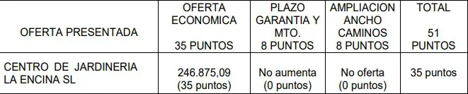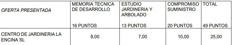 Yendo al detalle de las distintas subdivisiones del proceso, en el que recogía las partes técnicas, La Encina obtuvo ocho de los dieciséis puntos en liza en la memoria técnica, 7 de 13 en el estudio de jardinería y arbolado –sector al que pertenece la empresa y en el que está centrado el proyecto- y 10 de 20 en el compromiso de suministro. Es decir, prácticamente la mitad de los puntos que podían lograrse en cada subapartado. La suma final asciende 25 puntos de los 49 de máxima a los que se aspiraba.