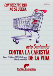 El próximo jueves 15 de febrero, el Partido Comunista de los Trabajadores de España (PCTE) ofrecerá una charla pública bajo el título «Contra la carestía de la vida» y con la que pretenden “concienciar de la grave situación de subida de precios generalizada que afecta especialmente a las familias trabajadoras.”