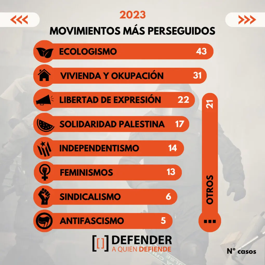En 2023, se notaron en la estadística los efectos de la reciente ola represiva contra colectivos y organizaciones ecologistas, pasándose de 27 detenciones de 2020 a 74 el año pasado.