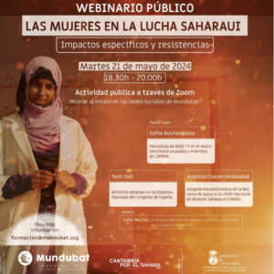 De la mano de Cantabria por el Sahara y Mundubat, miembros ambas de la Coordinadora Cántabra de ONGDs, este martes se celebrará el webinario público ‘Las mujeres en la lucha saharaui. Impactos específicos y resistencias’.