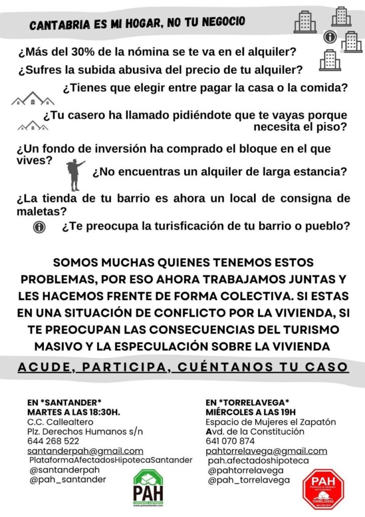 La Plataforma de Afectados por la Hipoteca (PAH) ha lanzando la campaña ‘Cantabria es mi hogar, no tu negocio’, centrada en recabar testimonios de afectados por las subidas de los alquileres y los pisos turísticos, fenómenos estrechamente relacionados en cuanto que rentismo y fondos están destinando la vivienda en alquiler hacia los usos turísticos, reduciendo la vivienda disponible y encareciendo los precios.