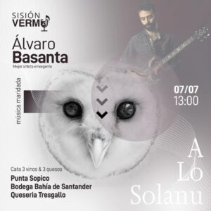 Como inicio del verano, este primer domingo de Julio, Álvaro Basanta, premio artista emergente de ‘Sisión Vermú’ tocará en acústico acompañado de los vinos de Punta Sopico y la bodega Bahía de Santander y los quesos de La Lleldiría & Tresgallo.