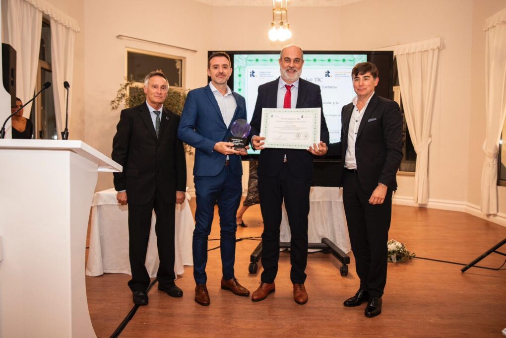 García recibió el premio ‘Impuls@ TIC’ de manos de Luis García y Luis Miguel González, gerentes de Erzia e ITM respectivamente, que estuvieron acompañados por el decano del Colegio Oficial de Ingenieros de Telecomunicación en Cantabria, Eduardo Artal.