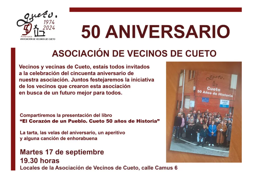 El próximo martes día 17 de septiembre la asociación de vecinos celebrará su 50 aniversario, para el que editó un libro de la historia de ese medio siglo de vida, incluyendo reflexiones sobre el asociacionismo vecinal y documentos relativos al territorio donde se delimitan geográficamente los cuatro pueblos de Santander, Cueto, Monte, San Román y Peñacastillo. Vivencias y anécdotas de los vecinos durante estos 50 años.