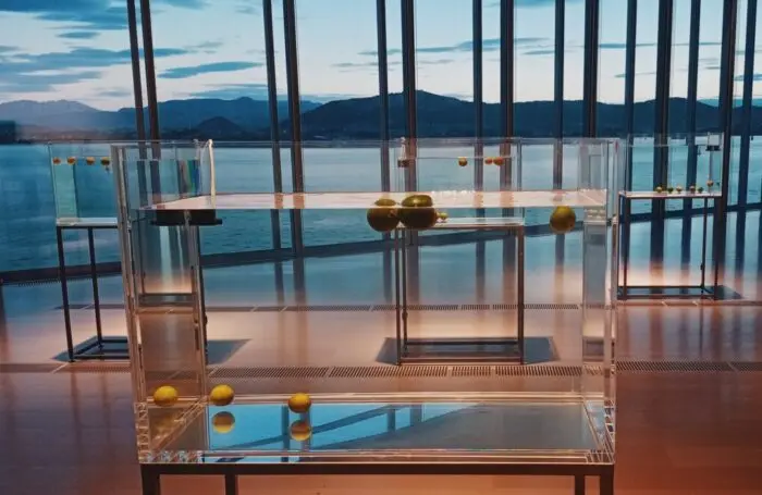 Una entretenida y festiva exposición que va a durar muchos meses en los que habrá que ir siguiendo el experimento (performance para los comisarios artísticos) de llenar acuarios sin peces de cítricos valencianos. Las frutas flotan, se hunden, suben, bajan, se hinchan de orgullo o se deprimen hasta el fondo. Cada día y cada hora van a ser diferentes en una estancia final que relaja: mar, peceras con limones, un cielo cambiante. No se la pierden y acudan en familia, con toda la clase o asesorados por el frutero de la esquina. Pregunten al personal de sala y disfruten.