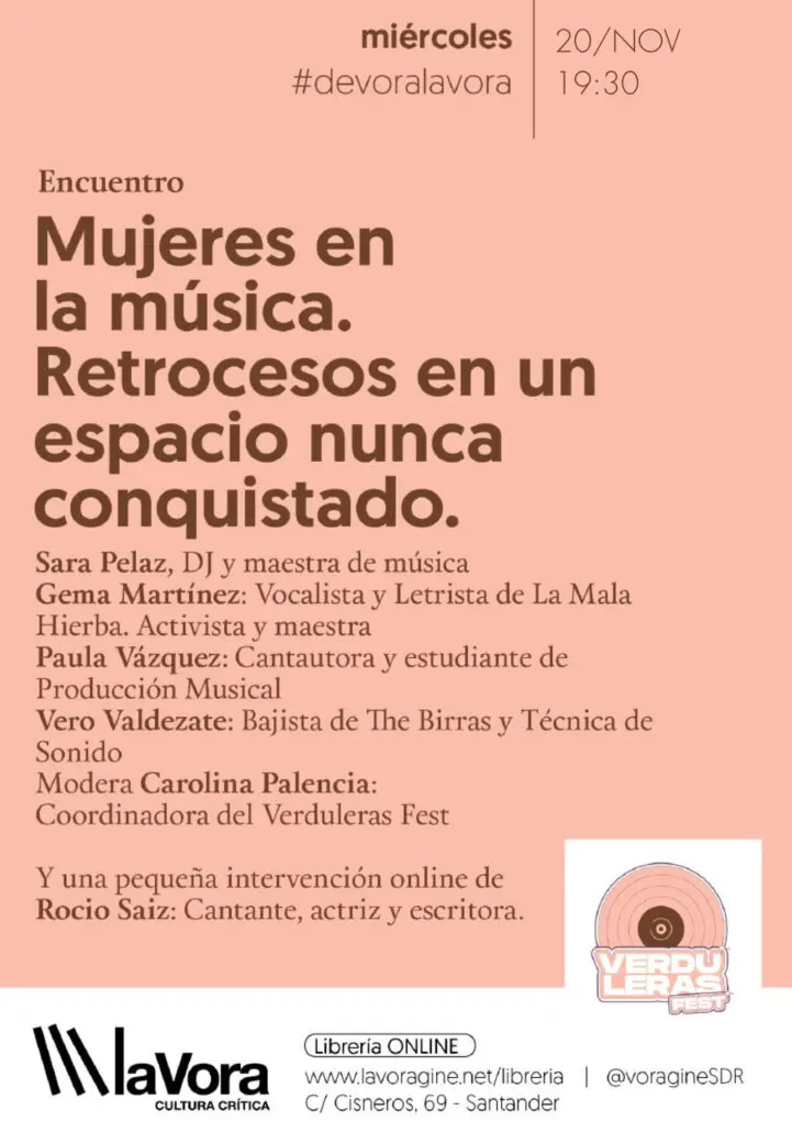 El próximo miércoles 20 de noviembre desde las 17:30 horas, dentro de las actividades que el festival Verduleras Fest tiene programadas en Cantabria, organiza una mesa redonda en la librería La Vorágine, en Santander, para dar visibilidad a “las grandes desigualdades de género que hay en la industria musical”, un problema, según las organizadores “extrapolable a otros ámbitos laborales dentro del mundo de la cultura”.