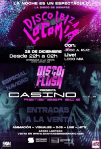 Escenario Santander despedirá el año de conciertos el sábado, 28 de diciembre, a ritmo de los abanicos de Locomía, que serán los artistas invitados a una nueva edición de las fiestas que la sala organiza recuperando el ambiente que se vivía en los años 80 y 90 en la desaparecida Discoteca Casino de Solares. Una cita bajo la gran bola de espejos que incluye DJ, animación, visuales y elementos navideños como espumillón o polvorones. La sala abrirá sus puertas a las 22:00 horas y a medianoche comenzará la actuación de Locomía.