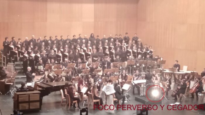 Sala Argenta llena, una orquesta, dos coros unidos en uno y diez temas de bandas sonoras como reclamo y exigencia. Al frente de la OSCAN y coros Paula Sumillera como directora triple: músicos y coralistas del Coro Lírico de Cantabria y del Coro Joven de Santander. 140 personas en el escenario dispuestas a hacer música de siete emblemáticas películas desde la más antigua -1966, compositor Ennio Morricone- a la más moderna -2004, compositor Alan Silvestri-. Ocho proyectores LED coloridos y giratorios capaces de mandar haces de luz hasta la fila 35, allá en las alturas palaciegas, y un foco incontrolado en contrapicado lo siguiente a molesto (inoportuno, fastidioso, cegador, ¿patrocinado por una clínica oftalmológica?). Insistencia en un pésimo diseño de iluminación, aunque fuera curioso ver a las autoridades con caras rojas y a los de las zonas B y C peleando con rayos verdes que les querían convertir en elfos. Luces en ráfagas, humos constantes, ventilador sonante… ¿esto era lo que el programa decía al hablar de “fructíferos diálogos entre música e imagen”?