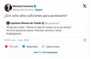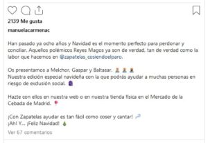 Embarcada en apoyar solidariamente a grupos sociales desfavorecidos, una campaña de apoyo a personas en riesgo de exclusión social está siendo un éxito por el humor que desarrolla su presentación: https://www.youtube.com/watch?v=ceE9yPXC_EY Una respuesta divertida al tweet que hace ocho fechas de Reyes Magos lanzó como ataque feroz Cayetana Álvarez de Toledo: “Mi hija de 6 años: ‘Mamá, el traje de Gaspar no es de verdad’. No te lo perdonaré jamás, Manuela Carmena. Jamás.” Han pasado más de 8 años de este tweet que forma parte del imaginario colectivo, pero la Navidad es tiempo de perdonar. Una historia que continúa transformada en una solidaria campaña navideña para Zapatelas. una asociación sin ánimo de lucro fundada por Manuela Carmena que realiza ropa, accesorios y juguetes. Aquellos polémicos Reyes Magos se han convertido en unos entrañables muñecos de Melchor, Gaspar y Baltasar elaborados artesanalmente.
