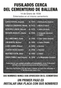 La ejecución fue cerca del Cementerio Municipal, donde seguidamente fueron enterrados en una fosa común, donde 87 años más tarde permanecen en el más absoluto anonimato, situación que el Colectivo cree que debe ser reparada urgentemente.