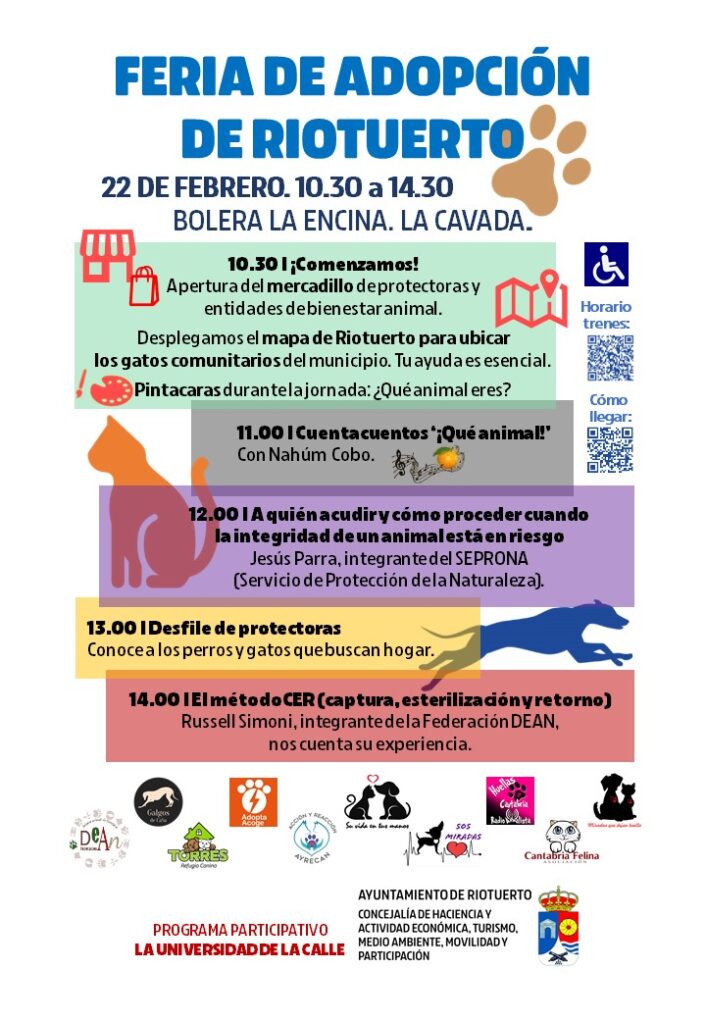 En el evento organizado por el ayuntamiento de Riotuerto participan la Federación DEAN, Galgos de casa, Refugio Canino Torres, Adopta o Acoge Cantabria, Acción y Reacción Animal Cantabria – Ayrecan, Su vida en tus manos, Asociación SOS Miradas, Huellas Cantabria, Cantabria Felina,Miradas que dejan huella y Adopta en los Abedules.