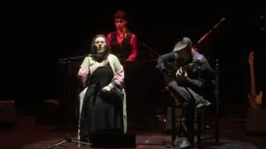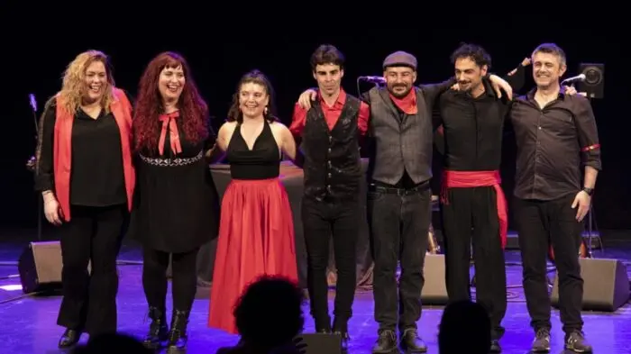 voz solista (Cristina Ceballos), panderetas y coros (Vanesa Fernández y Soltxu). Un grupo animoso que fue creciendo en intensidad sonora en tonadas cantadas con variaciones originales (esa ‘Tarara‘ de aquí mismo). Juan se multiplicaba ora con su flauta travesera (pareciendo el nuevo Ian Anderson), ora con el saxo tenor, ora con la gaita o el saxo alto. Cada canción fue un goce, empezando por las alegrías del “Trepeletré” y terminado once temas más tarde con un “Set de Jotas” (así se dijo, aunque el partido acabó con un bis final). Dos momentos preciosos: la invitación a Esther Terán a compartir escenario con la guitarra de Jaime en una canción muy especial de quintos que rinde homenaje a los jóvenes campurrianos que partieron a la guerra de Cuba: “El soldado”. El segundo fue el bis, donde Juan demostró ser ya en maestro tañedor capaz de dar muchos matices nuevos a “Tres hojitas madre”. Como dice el eslogan de esta temporada palaciega: Disfrutamos, crecimos y nos acordamos de Esteban Sanz, el programador que animó a Juan a “esta presentación soñada”. Un proyecto de folk que pide continuidad.