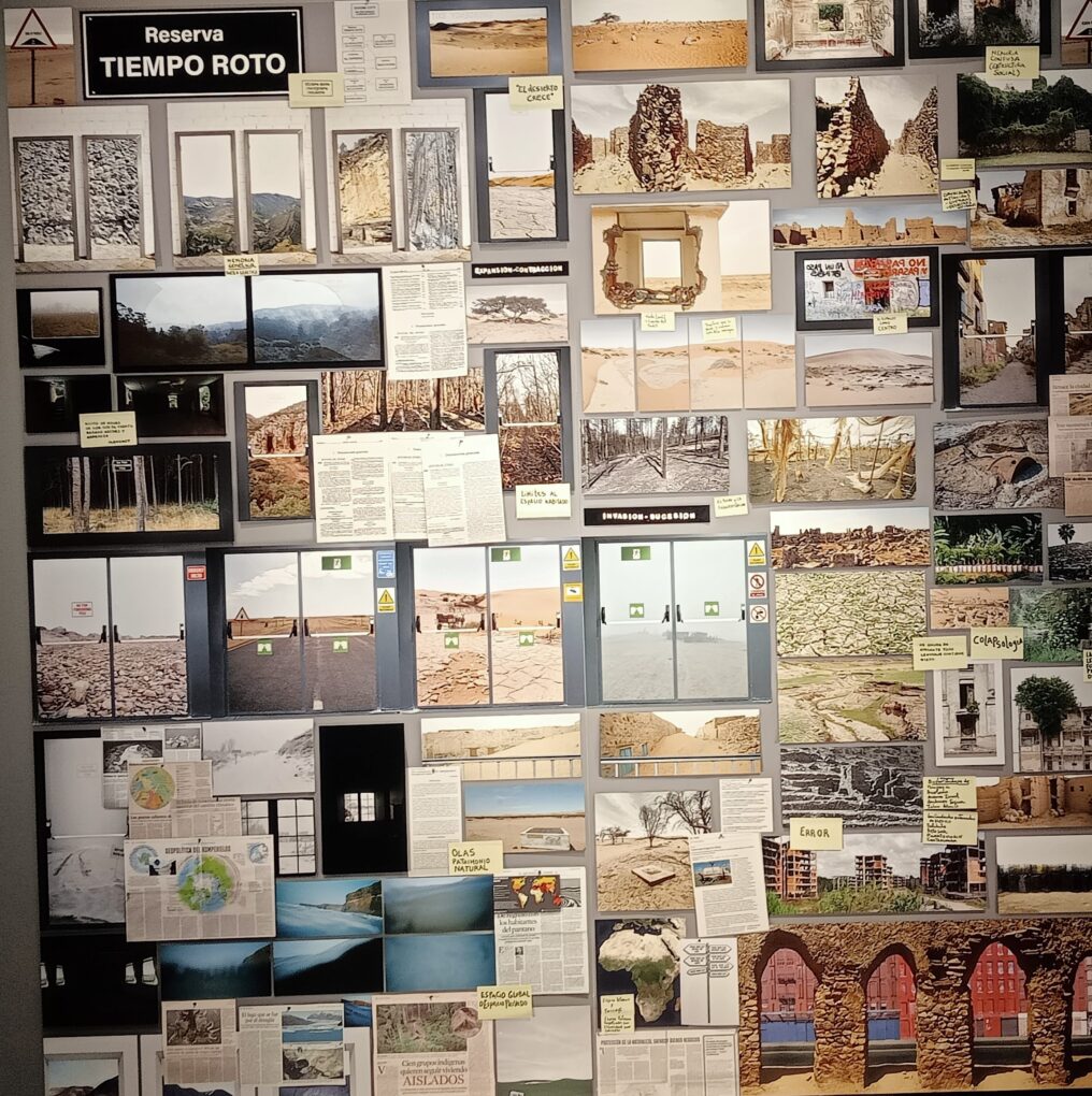 Con cuadros, unos de una sola fotografía y, otros, con composiciones abigarradas de muchas, entreveradas con recortes de prensa de distintos tiempos y lugares, la artista presenta a quienes entramos en la sala expositiva -no importa tanto el proceso creativo seguido, como su resultado- un panorama de espacios cerrados y abiertos, repartidos por el mundo, expresión de la desolación, exentos de seres humanos, como si hubieran sido arrojados a los márgenes de la historia por otros seres humanos, exentos de humanidad, que suplen con disposiciones legales, cargadas de injusticia.