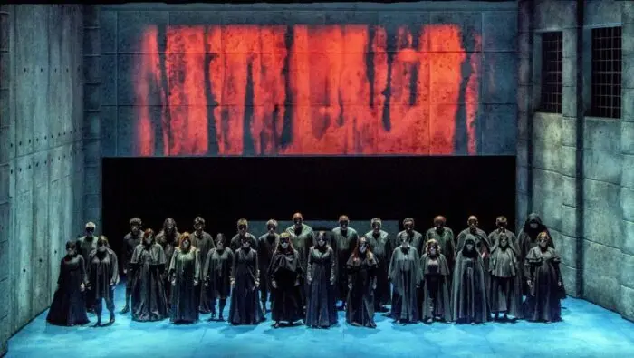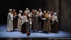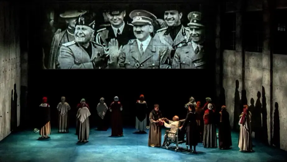 Con muchas otras cosas poco comprensibles (traducción galopante o retardada, Stalin e Hitler de nuevo en pantalla) la ópera fue ganando conforme llegaron los momentos estelares en el segundo y el tercer acto: muerte de la priora, votos de martirio de las carmelitas, monjas de paisano encarceladas, el camino al cadalso cantando la ‘Salve Regina’…