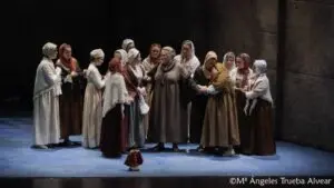 Todo se presagiaba desde que se levantó el telón, viéndose paredes grises por todos lados con rejas en las alturas y seis ocultas puertas laterales. Iluminación de bajo presupuesto. La orquesta Oviedo Filarmonía -lo mejor- no cabía en el foso, teniendo las principales percusiones a la vista, en dos laterales que sirvieron para conocer a sus instrumentistas de cerca (¿por qué no se pusieron los nombres de los músicos de la orquesta en el programa y poder elogiar, por ejemplo, a los/las dos invisibles arpistas?). Su director, Pedro Halfter, se esforzaba por lograr dar suavidad a los interludios esperando que no ocurrieran otras disonancias con lo que se veía en el escenario. Viéndolo disfrutar en su masterclass previa, debió sufrir con la música pregrabada de una guillotina que no iba a compás (sí, pregrabada). Cada monja desaparecía poco antes o poco después del sonido mortal: ¿cuchillas de segunda o tercera mano?