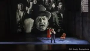 redundancia que puede revelar el cúmulo de extravagancias vistas y oídas: una novelista alemana del siglo XX paseando por el escenario, lo mismo que un achacoso anciano del mismo siglo con bastón y oficio de escritor, la Cruz Roja en el siglo XVIII (incoherente), proyección de imágenes cinematográficas que interrumpen lo musical, letreros y frases que remarcan lo obvio (miedo, terror), la sangre derramada fluyendo hacia arriba… Desastre de escenografía y dramaturgia. Siendo una producción rescatada de otros teatros, ¿nadie se ha dado cuenta de que lo que lastra, confunde y hacen incomprensibles los paralelismos son estos añadidos absurdos? (Unos más: cameos de Stalin, Mussolini, Adolf Hitler y sus tropas, revolucionarios franceses gritando a cámara, toneladas de ropa amontonada antes de gasear a sus portadores… Una ‘delicia’ de espectáculo aprobado y con el visto bueno de demasiados artistas concatenados).