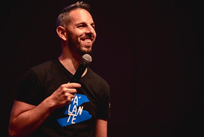 La sala Argenta presentó el viernes pasado un doble lleno al que solo faltaron los espectadores retrasados. Craso error de estos; cada pareja, trio o cuarteto corraliego era interpelado desde el escenario por el cómico David Cepo (Madrid, 1988) para conocer los porqués: que si es culpa de este, que si el Nissan no encontraba sitio donde aparcar, que nos hemos equivocado de hora… todo a pantalla grande. Un sistema este de cámaras apuntando al público que sirve para hacer entretenidos los prolegómenos donde cada enfocado/a saludaba divertido y en un 80% se daba un beso con el acompañante. Diversión oscular asegurada.