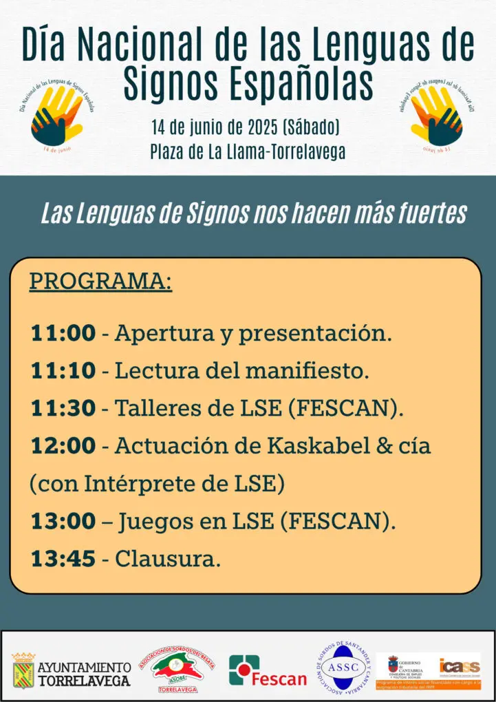 En Cantabria, el Día Nacional de las Lenguas de Signos Españolas se celebra este año en Torrelavega, organizado por la Asociación de Sordos del Besaya, (ASOBE) y la Federación de Asociaciones de Personas Sordas de Cantabria (FESCAN), con la colaboración del Ayuntamiento de Torrelavega. Bajo el lema “Las lenguas de signos nos hacen más fuertes”, Las dos entidades han elaborado un programa en el que combina la reivindicación con el aspecto lúdico del día de fiesta; talleres, juegos y cuentacuentos en lengua de signos y la actuación del grupo teatral “Kaskabel & Cía”, que será accesible con intérprete de lengua de signos española, además de la lectura del manifiesto de este año.