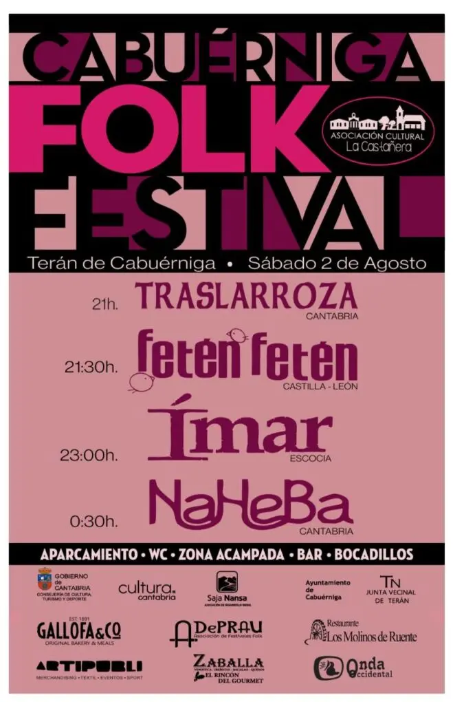 Una de las propuestas más esperadas será el Festival Folk, que se celebrará el 2 de agosto en el recinto Manuel Llano de Terán. A partir de las 21:00 horas, el público podrá disfrutar de las actuaciones de Traslarroza, formación cántabra que abre el cartel; Fetén Fetén, dúo de música tradicional castellana con propuestas instrumentales creativas; el grupo escocés Ímar, referente europeo del folk celta; y los también cántabros Naheba, que cerrarán la noche a partir de las 00:30 horas.