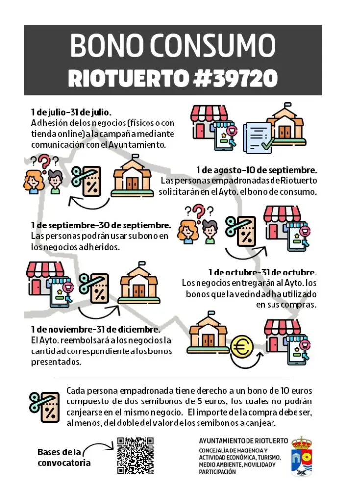 Del 1 al 30 de septiembre será el período de uso de los bonos en los que la vecindad de Riotuerto podrá canjearlos en los negocios adheridos. Acabado el mes, los negocios entregarán durante el mes de octubre al ayuntamiento los bonos que la ciudadanía ha utilizado en sus compras y la administración reembolsará la cuantía antes de acabar el año.