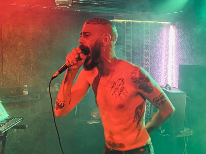 Ante una sala con una buena asistencia de público subió al escenario Alex PIS, que como él mismo indicó también tenia disponible su larga duración «El canto del cisne» (Infest Records, 2024) album que presenta en su cubierta un cisne siendo atacado por varios perros de caza, una miagen violenta y poética como el propio disco. El set de PIS consistia en un sinte analogico Korg, un portatil, un pequeño teclado y un micro como armas de predicación masiva. musicalmente las canciones de Alex, se mueven entre la electrónica, la canción ligera española y el punk mezclados sin fisuras y sin complejos con la sabiduria del que sabe lo que está haciendo. Pero si ya destaca su música, su presencia y actitud escénica es sobresaliente, una vez me decía mi fallecido amigo Dani Ulecia (El Columpio Asesino) que «Un concierto son dos cosas, lo que escuchas y lo que ves». La actitud en el escenario de Álex de rabia, violencia y autolesiones nos trae a la memoria directamente al mismísimo GGAllin, pero por si eso no fuera poco, las cuidadas letras que escupe describen el amor y el odio de nuestra podrida sociedad actual con una visión política y una manera de cantarlas que nos recuerda al asturiano Pablo Und Destruktion.