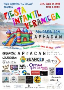 La Asociación de Padres del Síndrome del Espectro Autista y otros TGD, APTACAN, con el apoyo de la concejalía de Servicios Sociales del Ayuntamiento de Suances celebrará el próximo jueves, 3 de julio, una fiesta infantil veraniega y solidaria que contará con muchas actividades para el disfrute de toda la familia como castillos hinchables, pintacaras, bingo, diferentes talleres y una merienda solidaria en una tarde donde la diversión estará asegurada.
