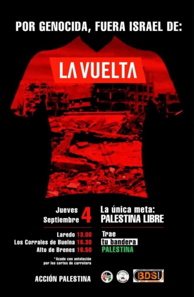 En Laredo, Izquierda Unida –que ha pedido la exclusión del equipo de La Vuelta y que en el municipio ha organizado reparto de banderas palestinas con una amplia acogida – ha convocado una concentración para el jueves 4 de septiembre a las 13:00 horas entre las calles López Seña y Garelly de la Cámara, (junto al BBVA).