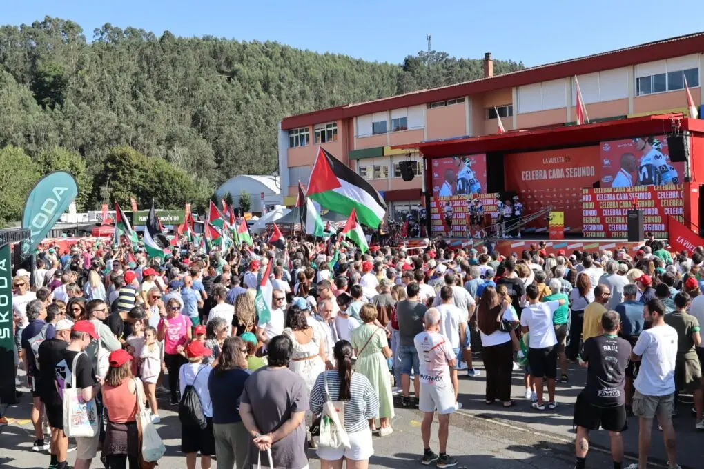 Las movilizaciones de Bilbao, que incluso paralizaron la etapa, se extendieron a Cantabria con una presencia masiva de banderas palestinas, con gente animando al invisible —y a la vez constantemente presente— “equipo gazatí”, sumando muchas más manos y gargantas que las de los colectivos habituales. De Laredo a Corrales, pasando por Riotuerto —cuyo Ayuntamiento aprobó una declaración institucional—, o al día siguiente en Cabezón de la Sal, donde existe un poso previo muy fuerte de activismo por Gaza.