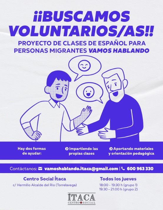 El Centro está buscando personas voluntarias para poder cubrir suficientemente las clases durante todo el curso. Bien sea impartiendo las clases, acompañados de otras personas, o también aportando materiales y orientación pedagógica. Para quienes estén interesados, pueden contactar con el centro a través del correo electrónico vamoshablando.itaca@gmail.com o llamando al 600 963 330.