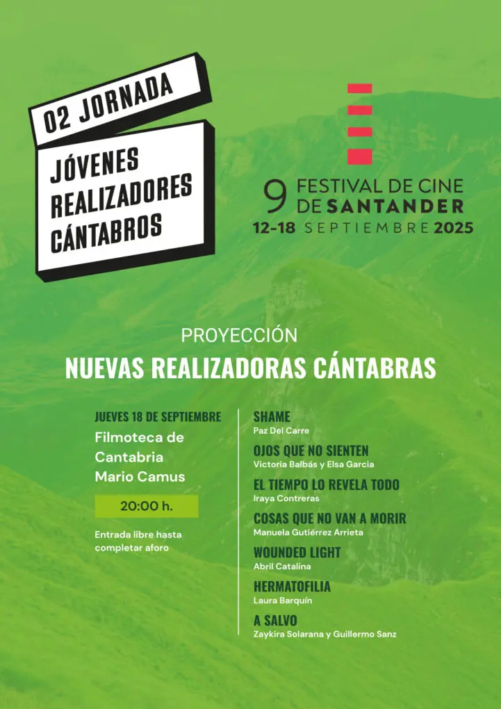 La iniciativa “Jornadas de Jóvenes Realizadores Cántabros” sigue realizando actividades para visibilizar a los nuevos cineastas de la región, en colaboración del Festival de Cine de Santander. La proyección será el jueves 18 de septiembre a las 20:00 en la Filmoteca de Cantabria Mario Camus (calle Bonifaz, 6) con la proyección Jóvenes Realizadoras Cántabras.
