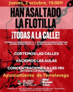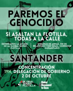 Este jueves por la tarde, a las 19:00, frente a la Delegación del Gobierno en Cantabria, junto a la Plaza Porticada de Santander y frente al edificio de Correos, está convocada una concentración para protestar ante la interceptación, por parte del ejército israelí, de la Flotilla de la Libertad, la Global Sumud Flotilla que se dirigía a las costas de Gaza para repartir ayuda humanitaria.