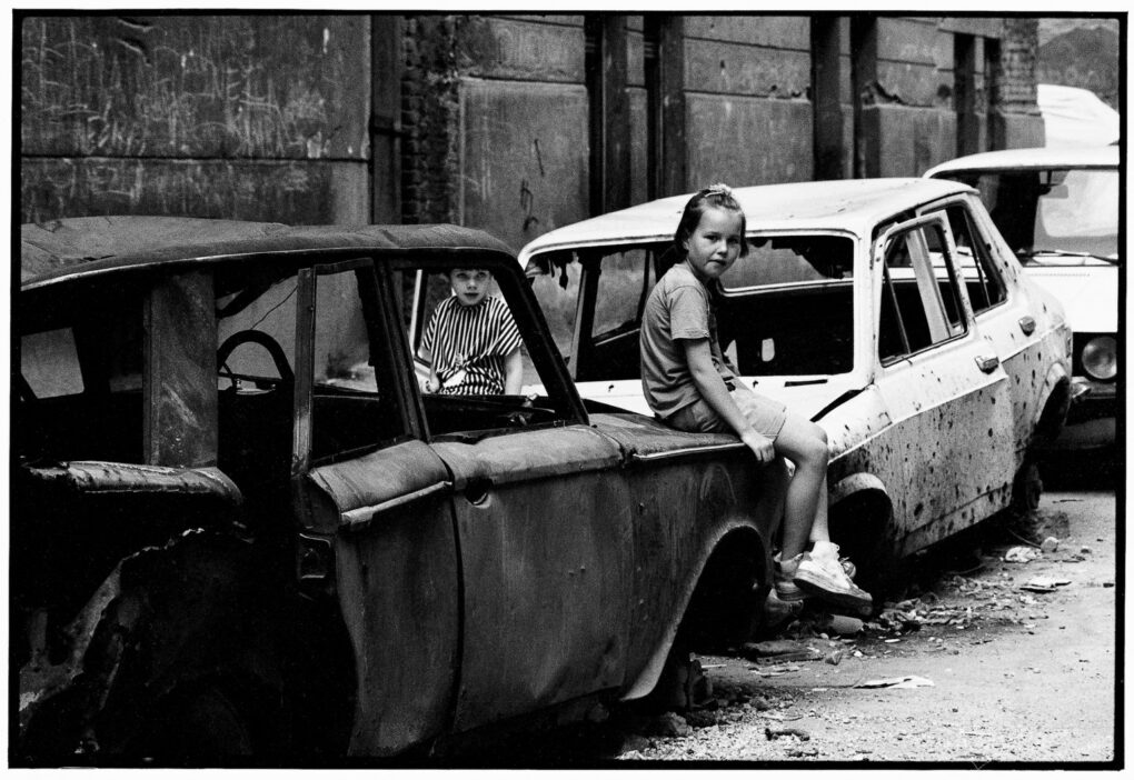 La fotografía fue tomada en Sarajevo durante el asedio a la ciudad, que se prolongó 1.425 días entre 1992 y 1996, el más largo de la historia moderna. En la imagen, una niña mira a cámara en un entorno devastado por la guerra, símbolo del sufrimiento civil en el conflicto de Bosnia-Herzegovina, que dejó más de 11.000 muertos, entre ellos 1.600 niñas y niños.