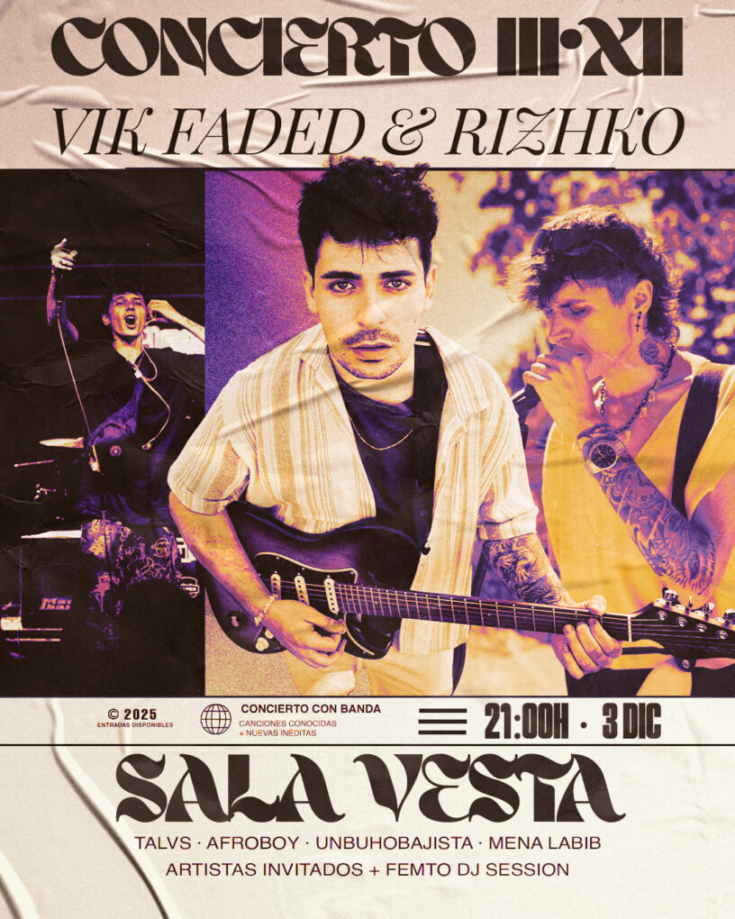 Madrid se prepara para una noche irrepetible el próximo 3 de diciembre a las 21:00h en Sala Vesta, donde los artistas Vik Faded y Rizhko se unirán en un potente directo que fusiona pop-rock, sonidos urbanos y matices alternativos. Una velada diseñada para quienes viven la música con intensidad y buscan propuestas frescas y llenas de energía.