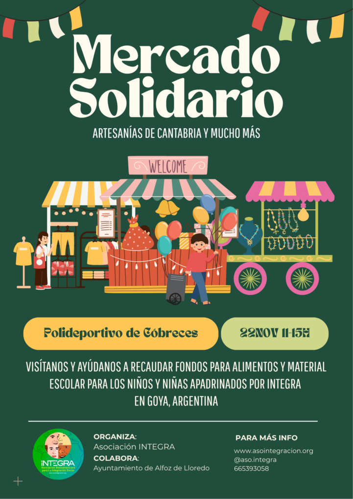 El próximo 22 de noviembre, el polideportivo de Cóbreces acogerá un mercado solidario que tiene como objetivo recaudar fondos destinados a la compra de alimentos y material escolar para niños y niñas apadrinados por la Asociación INTEGRA en Goya (Argentina). El evento se desarrollará entre las 11:00 y las 15:00 horas.