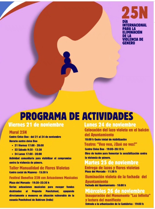 El lunes 24 se procedió a la colocación del lazo violeta en el balcón del Ayuntamiento a las 10:00 horas, seguido por la representación de la obra teatral ‘Veo veo, ¿quién no ves?’ en el Centro Cívico Boo a las 18:00 horas, dirigida a sensibilizar sobre la violencia de género a través de las artes escénicas.