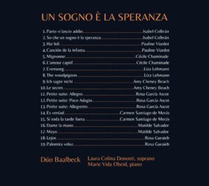 El programa del nuevo y reciente disco incluye obras de nueve compositoras: Isabel Colbrán, Pauline Viardot, Cecile Chaminade, Amy Beach, Liza Lehmann, Carmen Santiago, Matilde Salvador, Rosa García Ascot y Rosa Guraieb. “Un Sogno è la Speranza” es un recital lírico con 19 piezas escritas por nueve mujeres diferentes, un trabajo con el que el Dúo Baalbek busca reconocer la herencia transformadora de estas compositoras.