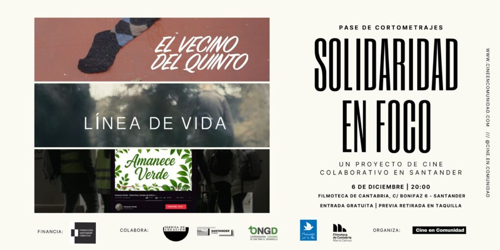 Este sábado 6 de diciembre a las 20:00 horas, la Filmoteca de Cantabria Mario Camus acogerá la proyección de los cortometrajes ‘El vecino del quinto’, ‘Línea de vida’ y ‘Amanece verde’, tres piezas audiovisuales realizadas en el marco del proyecto ‘Solidaridad en foco’, una iniciativa de cine colaborativo en Santander impulsada por la asociación Cine en Comunidad.