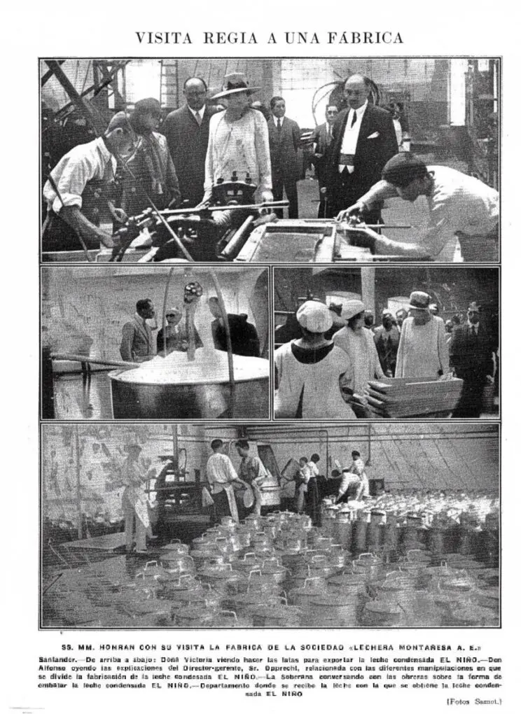 Reportaje fotográfico de la visita de Alfonso XIII y Victoria Eugenia a la fábrica de “La Lechera Montañesa” en Torrelavega. Fotografías de Samot en La Unión Ilustrada, 1/9/1927