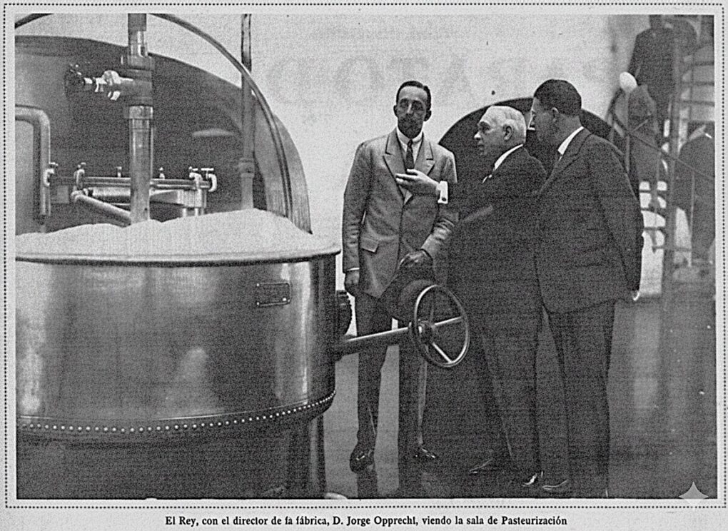 Alfonso XIII recibiendo explicaciones del proceso de pasteurización en “La Lechera Montañesa”. Mundo Gráfico, 1/9/1927