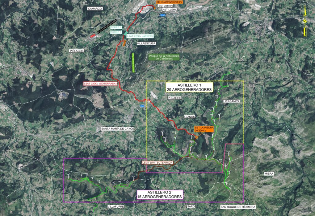 Los polígonos eólicos Astillero 1 y Astillero 2 no son una abstracción ni un dibujo sobre plano, afirman. Sumarían 156,5 megavatios de potencia instalada y 35 aerogeneradores de casi 200 metros de altura a punta de pala, repartidos entre montes y crestas de Liérganes, Penagos, Santa María de Cayón, Villafufre, Saro, Miera y San Roque de Riomiera. Cada máquina, con un rotor de 163 metros de diámetro, se implantaría sobre un territorio ya en uso, al que se añadirían nuevos viales, zanjas, cimentaciones y líneas eléctricas. La energía de ambos polígonos estaría proyectada para concentrarse en la subestación La Piedra (30/220 kV), en Penagos, y evacuarse mediante líneas de alta tensión de 220 kV hasta Guarnizo, conectando finalmente con el nudo eléctrico de Astillero. Todo ello formaría parte de un mismo corredor energético, con impacto directo sobre el paisaje y la vida que lo habita.