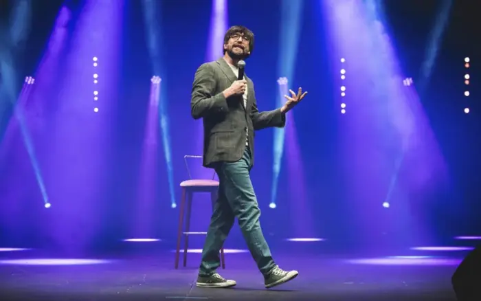 Cuando el Palacio de Festivales llena su sala grande (1600 personas) siempre hay problemas: largas colas en la calle, retrasos en la entrada, goteo de espectadores comenzado el espectáculo. El domingo pasado volvió a ocurrir con el humorista y mago de la palabra Luis Piedrahita (A Coruña, 1977) que desde bambalinas lo tomó con humor: “El problema es que todavía hay gente fuera y creo que es mi obligación hacerles saber que ya empezamos. Les propongo que contemos hasta tres y después soltemos carcajadas estruendosas, brutales, con lanzamiento de piojos y ropa femenina (sic)…”. Y así se hizo. A los doce minutos el artista consideró que ya podía empezar con su monólogo guionado con la ayuda de un público nada anónimo: Martín, Pedro, Gonzalo, Diego… Piedrahita sigue la moda de que el entretenimiento esté en las gradas.