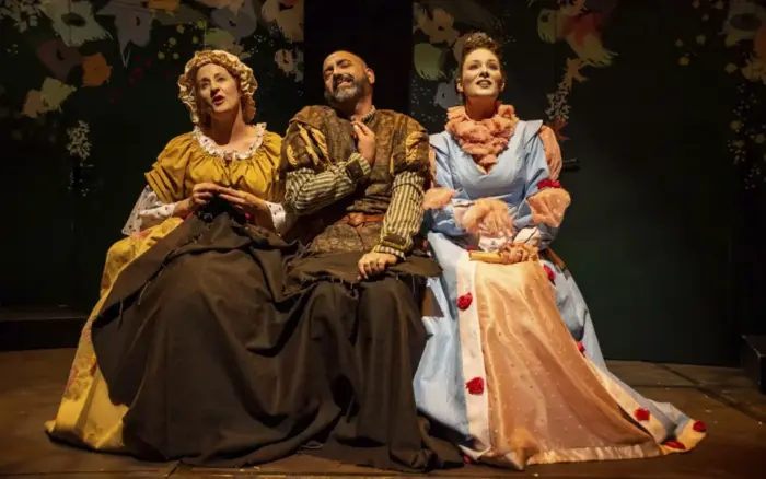 Retomada por una compañía de origen extremeño -emeritense por más señas- lleva varios años siendo representada por teatros romanos y salas con ganas de divertimento. Después de un aplazamiento el pasado 14 de diciembre se pudo ver y disfrutar en una sala Pereda llena que no se sorprendió de un ruego previo desde el escenario: “Tenemos entendido que en el barroco no había móviles…” y los hubo en sala, pero apagados. Sin más dilación, sonó una jota y comenzó la función.