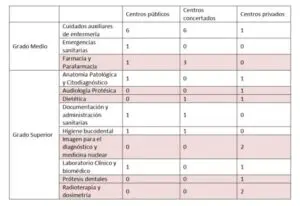 El sindicato rechaza el incesante incremento de módulos profesionales de FP del sector sanitario en centros educativos concertados o privados cántabros, que ya cuentan con 22 de ellos (10 de grado medio y 12 de grado superior), en detrimento de una disminución de la oferta pública que ahora se limita a 12 (8 de grado medio y 4 de grado superior).