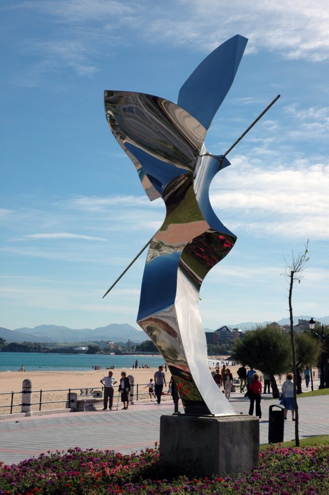 En el caso del Quijote santanderino, la figura no se representa de manera literal, aunque un ‘quijotólogo’ reconocerá enseguida su delgada y triste figura, o sus compleementos. La pieza se construye a partir de formas dinámicas y ascendentes que evocan impulso y tensión. El acabado pulido del acero convierte la superficie en un plano reflectante que incorpora el entorno urbano a la experiencia estética.