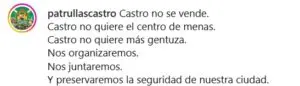 Patrullas Castro abrió su actividad en redes sociales la semana pasada con un mensaje que dejaba bien claro que otorga a menores migrantes no acompañados la misma categoría que a otros seres humanos, porque los calificaba como «gentuza», además de proclamar que se encargarían de preservar la seguridad del municipio.