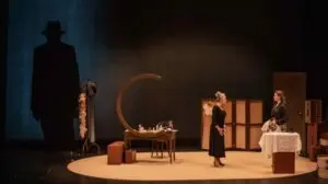 Desenlace: La obra atrapa desde el principio. El breve episodio de la muerte de Gregorio ya anuncia antagonismos -“¡Que poco conoces a tu padre!”- que no acaban de ser resueltos del todo. Un papel de hija algo desdibujado: acaba de volver a ver a sus padres después de once años y sus problemas son otros. Sumergidos rápidamente en los nervios de un estreno que es la reaparición de Catalina en España se suceden los mejores momentos: los tres duelos actorales de Nuria Gallardo con Miriam Diaz-Aroca y el de la sombra de Juan Gea con todos. Brilla Nuria con la fuerza que imprime a sus personajes (nada menos que María Guerrero y María Lejarraga) y la vis cómica de su tercer papel de periodista un poco franquista. Miriam aguanta dos horas en escena entre un torrente de emociones que es difícil de interpretar. Juan Gea muestra aplomo y Megan Tyler defiende a una hija creíble.