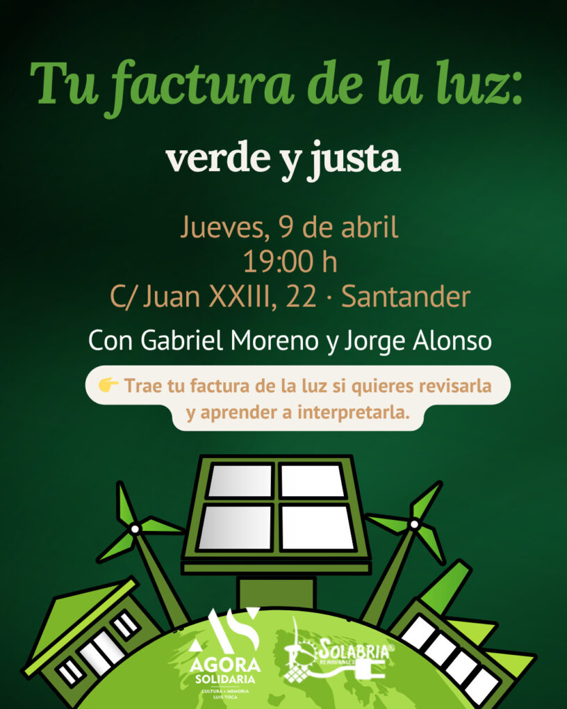 El espacio del Ágora Solidaria Cultura y Memoria Luis Toca (ASCM), en Santander, en la calle Juan XXIII, 22, será escenario el próximo jueves 9 de abril, a partir de las 19.00 horas, de la charla titulada ‘Tu factura de la luz: verde y justa’, una propuesta abierta al público hasta completar aforo.