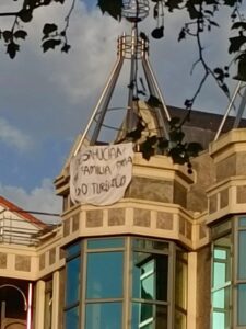 Sin embargo, activistas colocaron una pancarta en lo alto del edificio de la vivienda desahuciada, en la que se podía leer «desahucian a una familia para uso turístico», subrayando la problemática que se complica por la reducción de oferta de vivienda en alquiler por la cantidad de inmuebles destinados a alquiler vacacional y no habitual.